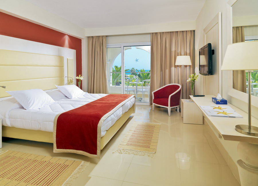 Die 301 Doppelzimmer und die 4 Junior Suiten verteilen sich in einem dreistöckigen Gebäude mit 1 Fahrstuhl. Sie bieten seitlichen Meerblick oder Gartenblick, 2 Betten oder Doppelbett, Terrasse, Telefon, Sat.-TV, kleiner Kühlschrank, Safe, Klimaanlage/Heizung, Bad mit Badewanne/Dusche und Haarföhn. Die Junior Suiten verfügen über einen separaten Salon. Außerdem verfügt das Hotel 3 komplett ausgestattete behindertengerechte Zimmer.